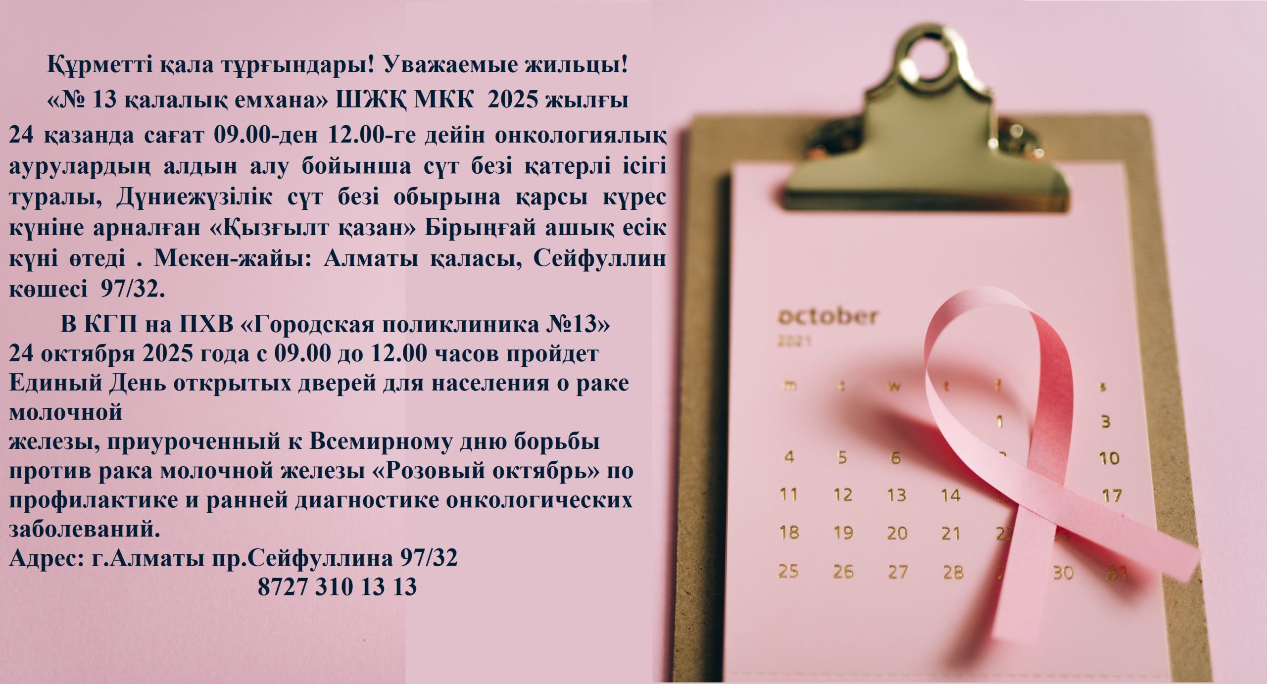 Читать далееҚұрметті қала тұрғындары! Уважаемые жильцы! «№ 13 қалалық емхана» ШЖҚ МКК 2025 жылғы 24 қазанда сағат 09.00-ден 12.00-ге дейін онкологиялық аурулардың алдын алу бойынша сүт безі қатерлі ісігі туралы, Дүниежүзілік сүт безі обырына қарсы күрес күніне арналған «Қызғылт қазан» Бірыңғай ашық есік күні өтеді . Мекен-жайы: Алматы қаласы, Сейфуллин көшесі 97/32. В…